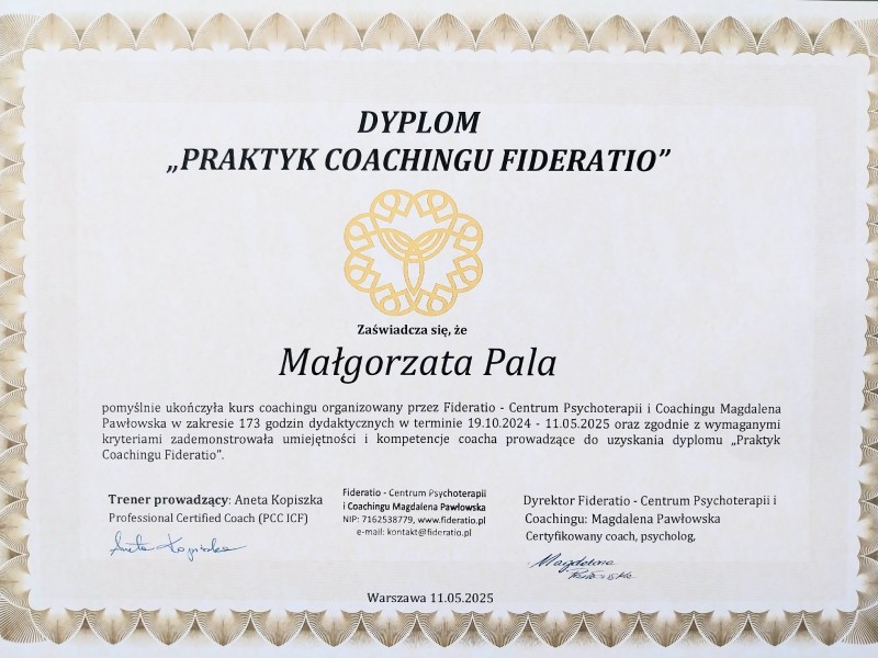 Małgosia dała mi się poznać jako osoba wszechstronnie uzdolniona, spokojna i wyważona, rozsądna i godna zaufania. Obserwowałam Małgosię prze 8 miesięcy Kursu Coachingu Fideratio i jestem przekonana co do kompetencji Małgosi w obszarze coachingu. Wspaniale słucha, prezentuje życzliwe nastawienie, dostrzega sedno spraw z jakimi pojawia się Klient, sprawnie i rzeczowo podsumowuje, towarzyszy z empatią i szacunkiem w projektowaniu przez Klienta adekwatnych rozwiązań. Polecam Małgosię jeśli pragniesz skutecznej zmiany w swoim życiu.